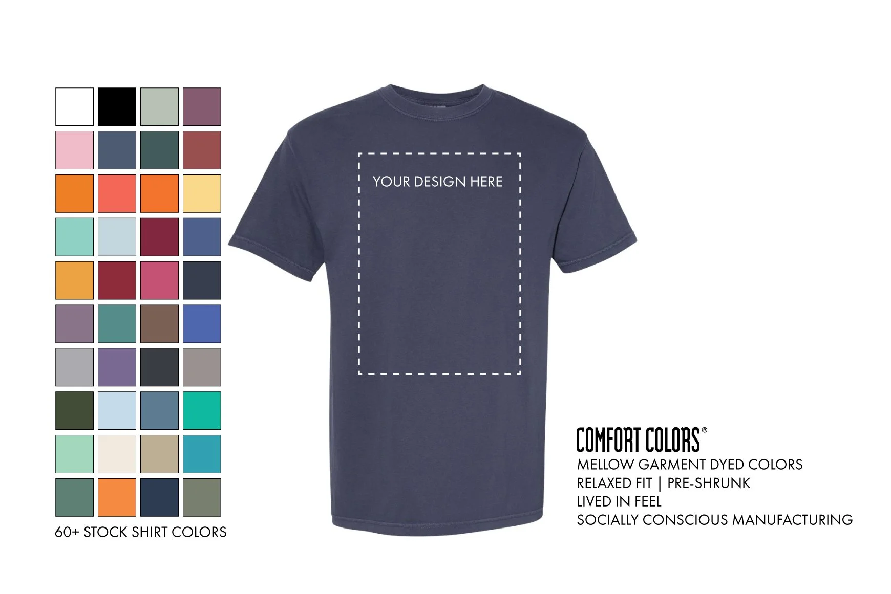 Any Comfort Colors Pigment Dyed Heavyweight t-shirt with your choice of single color print (1 Print Location) for just $10.00 each.